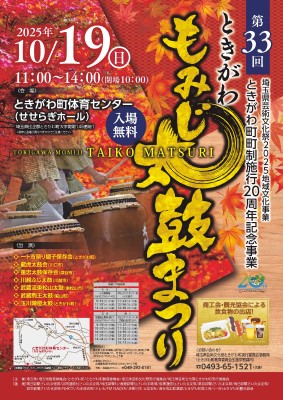 埼玉県芸術文化祭2025地域文化事業として、ときがわもみじ太鼓まつりを開催し、全県的な発表・交流を行うことにより、広く県民の参加・創造の意欲を喚起し、日本の伝統芸能「太鼓」を通して芸術文化の次世代育成、発展を図るとともに地域文化の振興に寄与する。