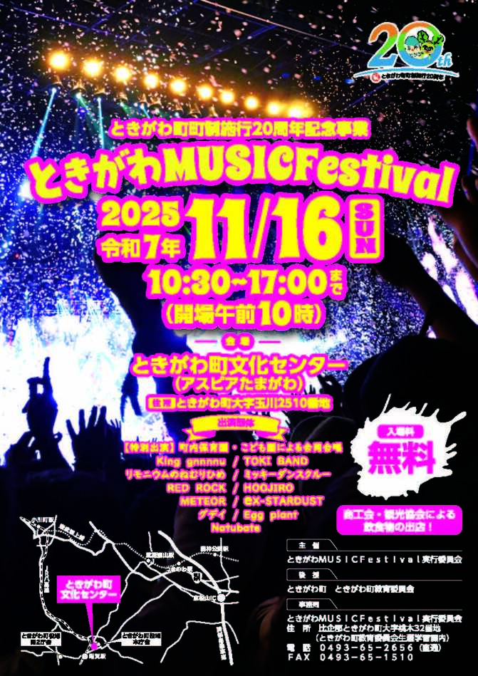 ときがわMUSICfestival実行委員会 (ときがわ町教育委員会生涯学習課内) TEL 0493-65-2656