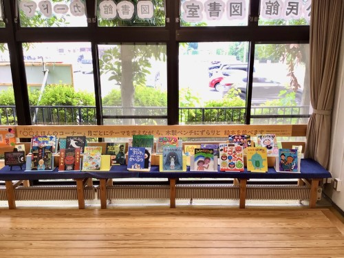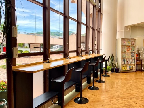 窓際に設置された5mのときがわ町産木製ベンチを活用して、絵本をずらーっとテーマ展示しています。奇数月のみの開催ですので、偶数月はベンチとしてご利用ください。
