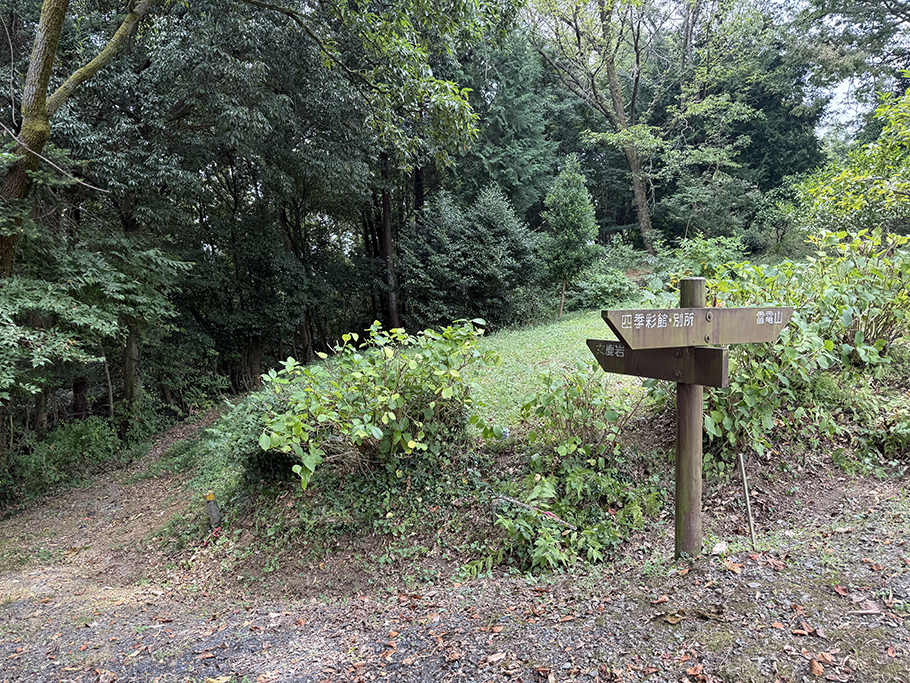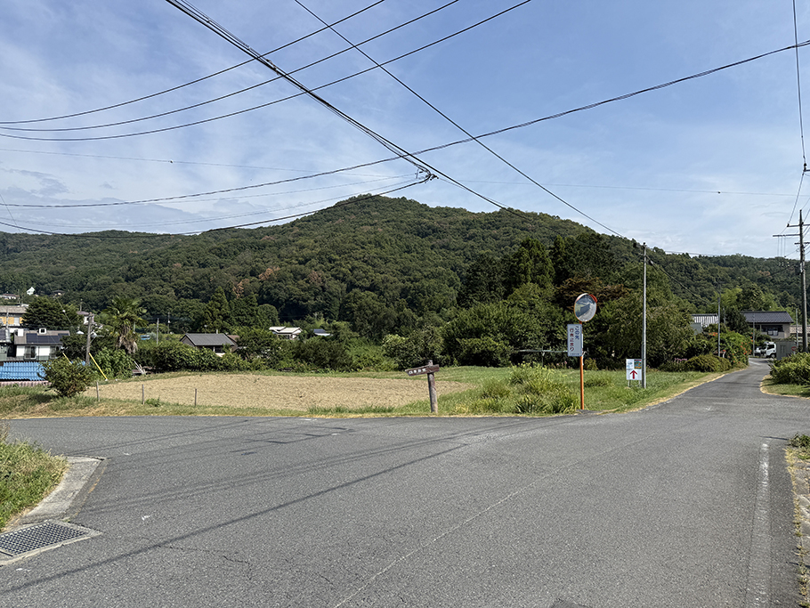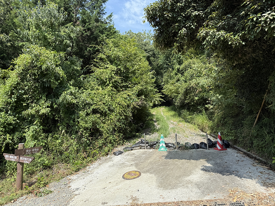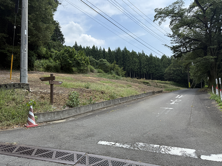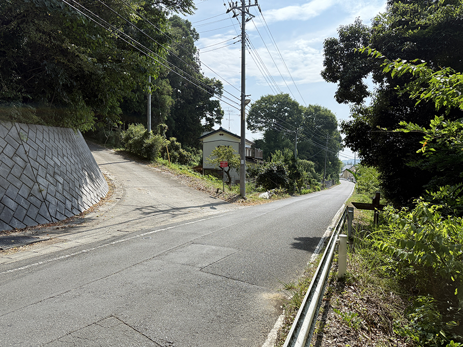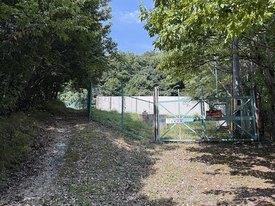 別所T字路から約10分ほど歩くと県受水施設入口に到着します。こちらを斜め左に入って坂を登ります。