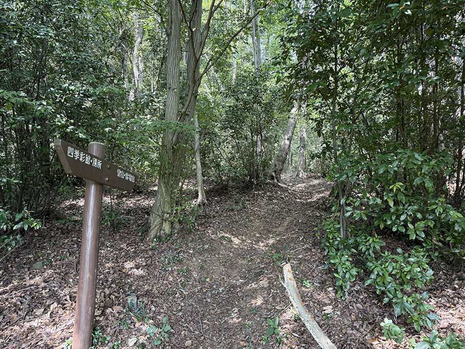 T字路を左に曲がり、女鹿岩方面へ進みます。看板があるので見落とさないように注意しましょう。(コース図⑦)