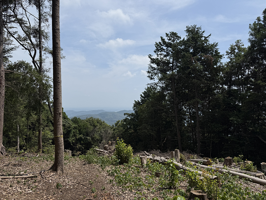 少し歩いて横を見ると自分が今まで歩いてきた山が見えます。この木の中を歩いてきたと思うと達成感を得られますね。