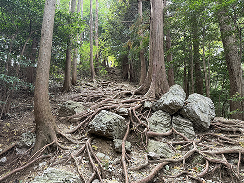 登山道は整備がされていて基本的には歩きやすいですが、画像のように自然を大いに感じられる場所もあって、とても楽しく歩くことができます。
