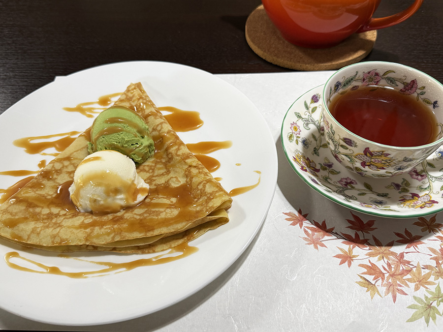 いこいの里大附から約1200m、歩いて15分ほどの場所に「峠の紅茶館 BELL WELL」というカフェがあります。こちらは日本紅茶協会でティーインストラクターの資格を取得した店主が営むお店で、美味しい紅茶とクレープがいただけます。(コース図③)