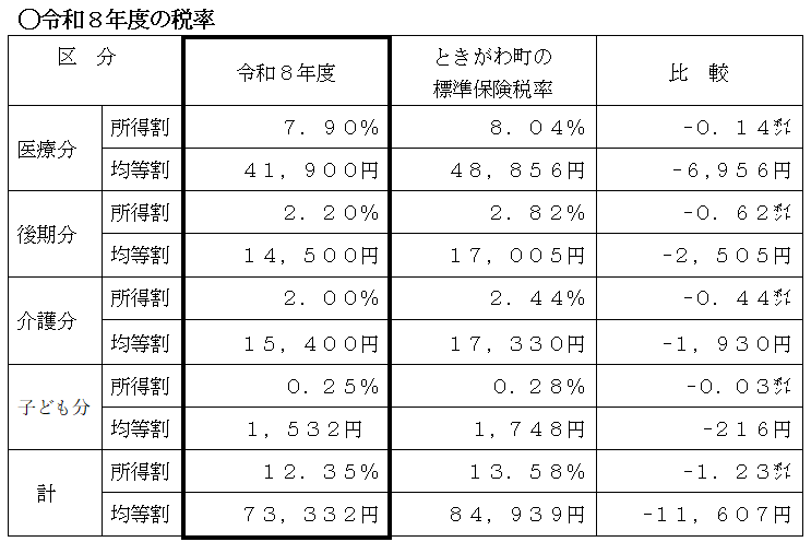 埼玉県国民健康保険運営方針に基づいた、令和8年度の国民健康保険税率は以下のとおりです。